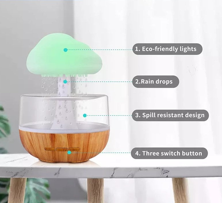 Elevate your relaxation sessions as this diffuser gently releases a delicate mist, carrying with it the soothing scents of your chosen essential oils, perfectly dispersing them throughout your room for an immersive aromatic experience. Complementing its functionality, the diffuser is equipped with serene blue LED lights and a calming rain cloud sound effect, meticulously designed to craft an ambient atmosphere that promotes ultimate relaxation.